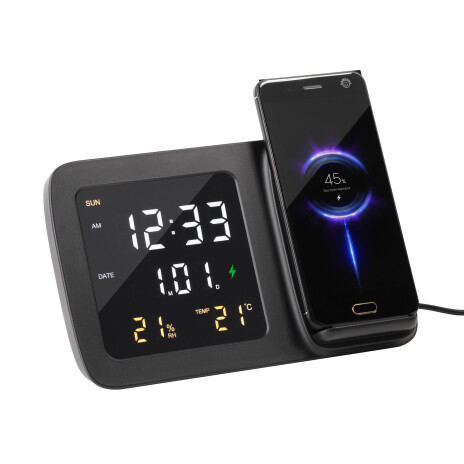 Настольные часы "Smart Screen" с беспроводным (15W) зарядным устройством, гигрометром, термометром, календарём, с подсветкой логотипа