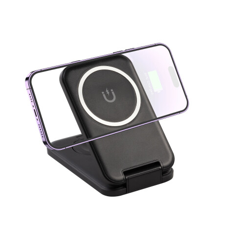 Компактный гаджет - складная беспроводная (15W) зарядная станция 3-в-1 с функцией MagSafe - магнитным держателем для iPhone двенадцатой серии и выше. Данный держатель позволяет закрепить (примагнитить) iPhone горизонтально на зарядном блоке для удобного просмотра фото/видео на его экране. Для большего удобства в конструкции подставки предусмотрены 2 угла обзора экрана.
