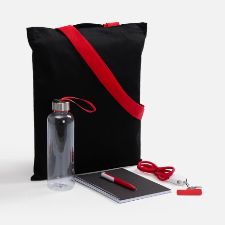 - Материал: сумка - хлопок, 240 г/м²; ручки - полиэстер; кабель-ланьярд - нейлон, пластик; металл; бутылка - пластик, пищевой; крышка - металл, пластик; блокнот - бумага, картон; ручка - пластик