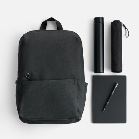 - Размеры: рюкзак: 27x40x14 см; зонт: длина 49 см, диаметр купола 90 см, длина в сложении 22 см; термобутылка: высота 23,5 см, диаметр 4,3 см; блокнот: 15,5х21х1 см; ручка: 13,7х0,8 см