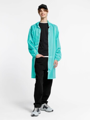 Плащ-дождевик из ткани таффета на молнии с капюшоном. Складывается в мешочек — удобно брать с собой.