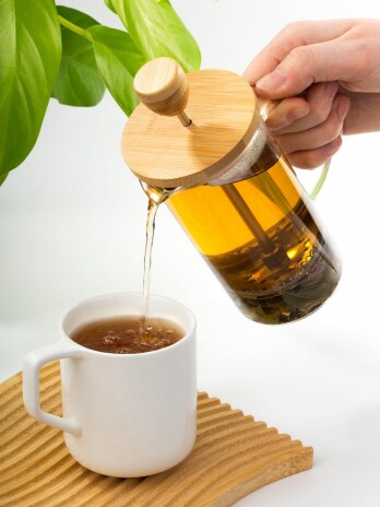 Френч-пресс с изящным сочетанием прозрачного боросиликатного стекла и натурального дерева станет стильным акцентом на кухне.
