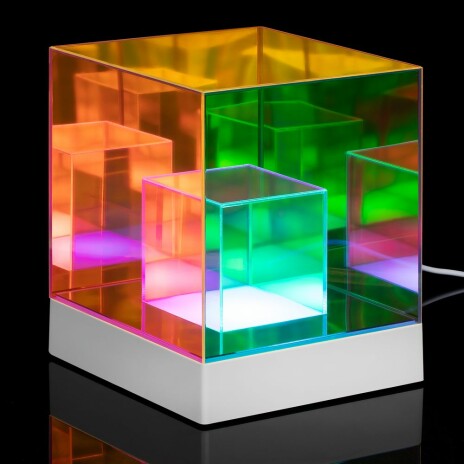 Cubini — интерьерный светильник с разноцветной подсветкой и удивительным оптическим эффектом. Разные оттенки граней и их множественные отражения мгновенно притягивают взгляд, заставляя рассматривать кубик снова и снова.