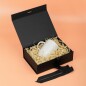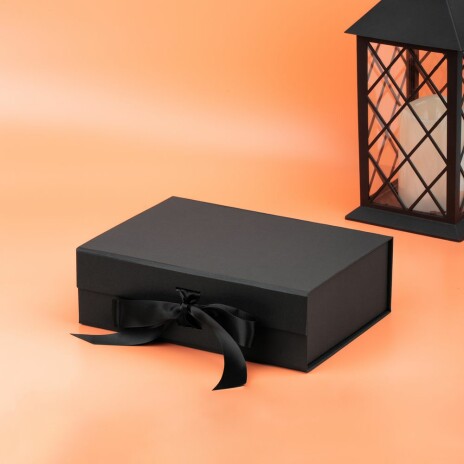 Коробка из переплетного картона, кашированного тонированной в массе крафтовой бумагой. Крышка на двух магнитах дополнительно фиксируется репсовой лентой.Толщина картона 2 мм.