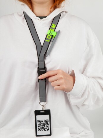 Лента для бейджа или пропуска с карабином и межъярусным замком. Такой замок позволит быстро отстегнуть часть ленты, чтобы приложить интерактивный бейдж или пропуск к считывателю, не снимая ленту через голову.