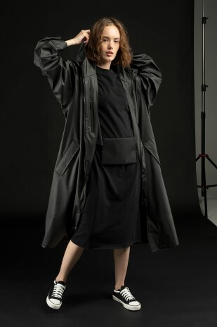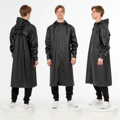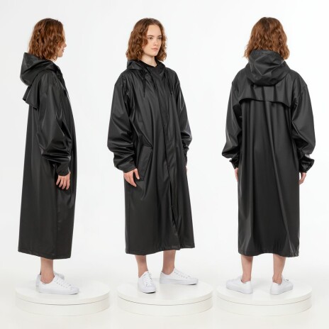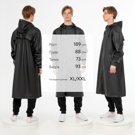 Плащ-дождевик с капюшоном из полиэстера с полиуретановым непромокаемым покрытием.