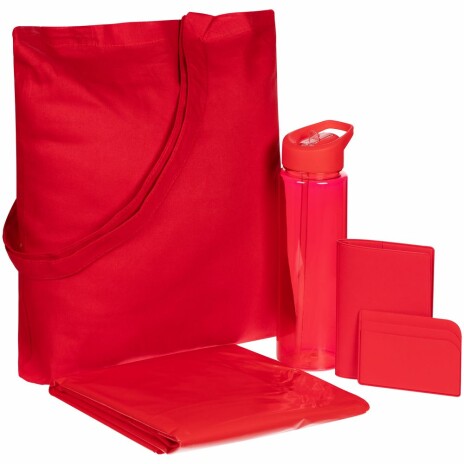 - Материал: обложка для паспорта, чехол для карточек - искусственная кожа; бутылка - пластик; сумка - хлопок 100%, плотность 105 г/м²; дождевик - полиэтилен