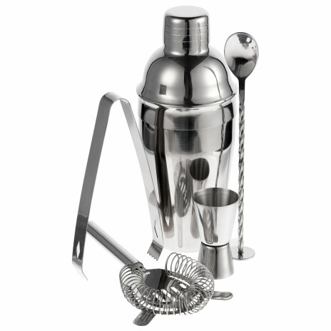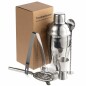 - Размеры: шейкер: диаметр 8,2 см, высота 22 см; стрейнер 18х9,5х2 см; джиггер 3,8х3,8х6,8 см; щипцы 16 см; барная ложка 20,5 см; упаковка 9,5х9,4х23 см