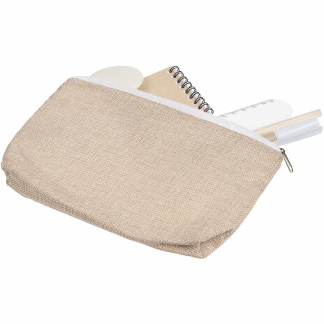 Стильный крафтовый набор с самыми необходимыми канцелярскими принадлежностями: мини-блокнотом в клетку, ластиком, удобной линейкой-закладкой и ручкой в компактном пенале-косметичке.