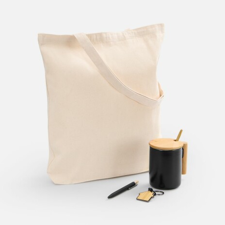 - Материал: кружка - керамика, крышка - бамбук; сумка - хлопок 100%, плотность 210 г/м²; саржа; брелок - бамбук, металл; ручка - металл, алюминий; кнопка - бамбук