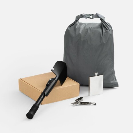 - Материал: лопата - сталь, пластик; резина; чехол - полиэстер; мультитул - нержавеющая сталь, алюминий; мешок - нейлон, рипстоп; полиуретан; фляжка - нержавеющая сталь, AISI 304; коробка - микрогофрокартон; наполнитель - бумага