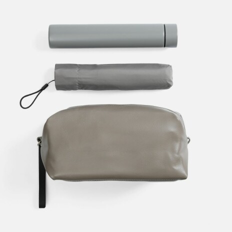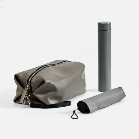 - Размеры: несессер: 22х12х12 см, в сложении 23х14х4 см; зонт: длина 49 см, диаметр купола 90 см, длина в сложении 22 см; термобутылка: диаметр 4,3 см, высота 23,5 см