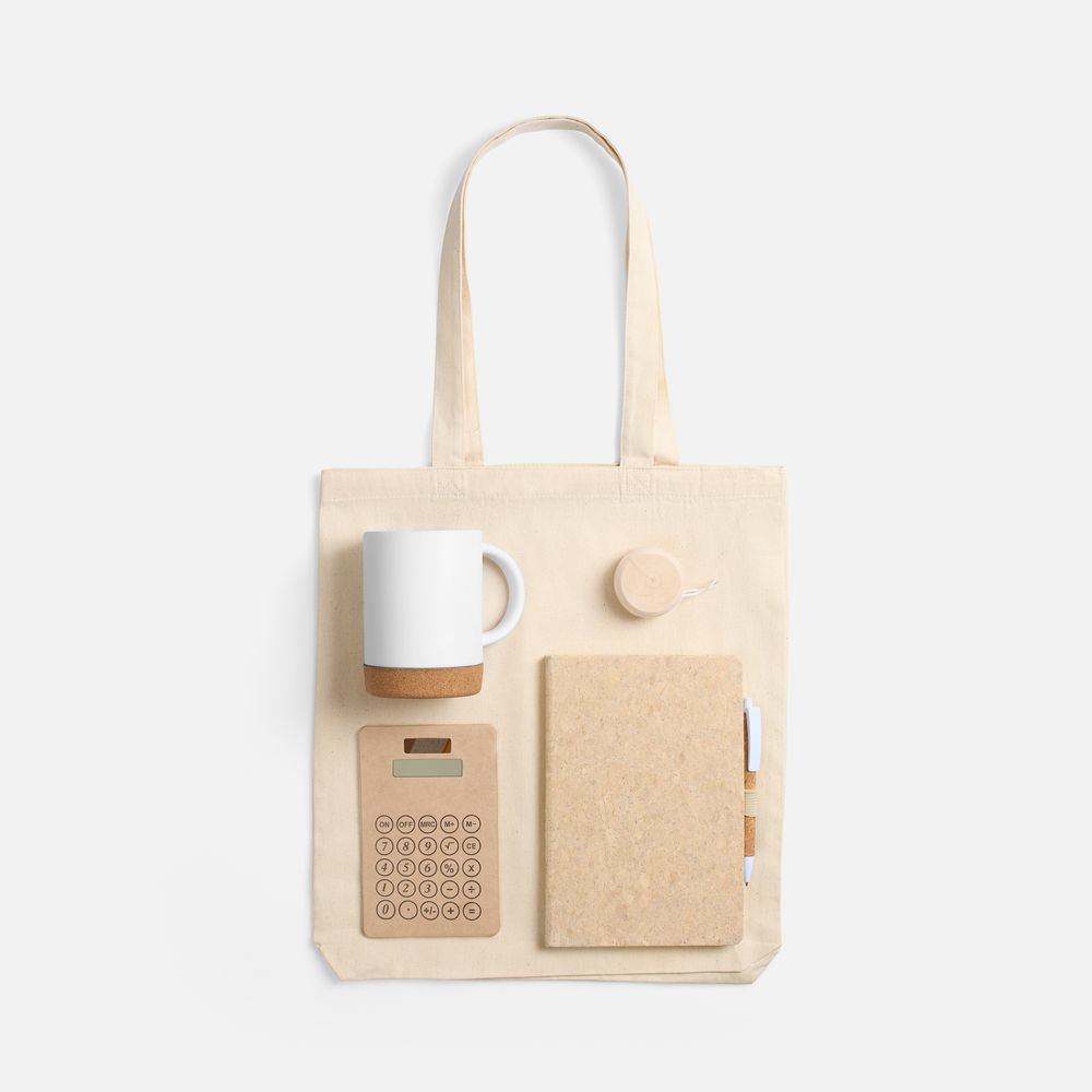 - Материал: блокнот - пробка; кружка - каменная керамика, подставка - пробка; калькулятор - картон; сумка - хлопок 100%, плотность 210 г/м²; саржа; игрушка-антистресс - дерево; ручка - пластик, пробка