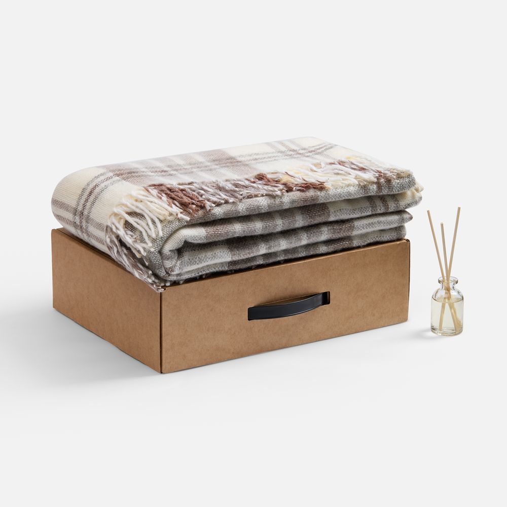 - Материал: плед - шерсть 50%; полиэстер 30%; акрил 20%; флакон - стекло, палочки - дерево; коробка - микрогофрокартон