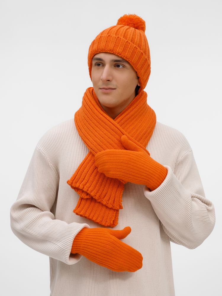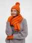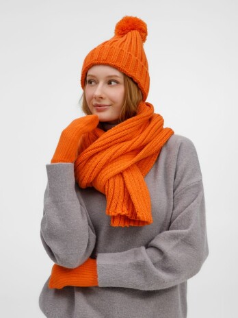 Шапка с пышным помпоном и отворотом, связанная крупной резинкой, создает игривый силуэт, а широкий шарф с выразительной текстурой надежно защищает от ветра, сохраняя свободу движений. Варежки с отворотом-резинкой плотно облегают запястье, не пропуская холод.