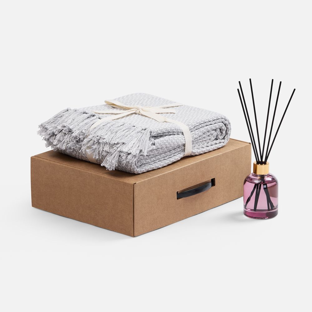 - Материал: плед - хлопок 80%, полиэстер 20%, плотность 260 г/м²; флакон - стекло, палочки из файбера; коробка - микрогофрокартон