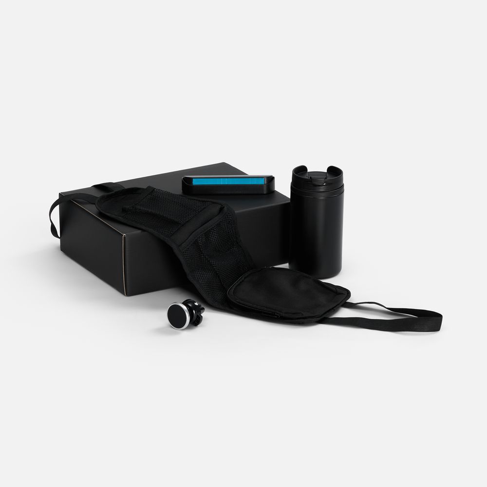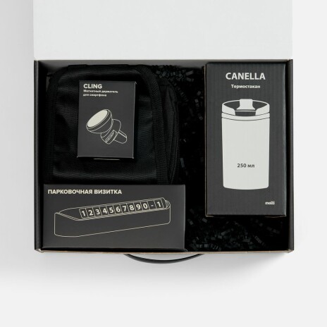 - Материал: внутренняя стенка и крышка стакана - пластик; внешняя стенка - нержавеющая сталь; магнитный держатель - АБС-пластик; парковочная визитка - пластик; органайзер - полиэстер 100%, плотность 600D; оксфорд; коробка - микрогофрокартон