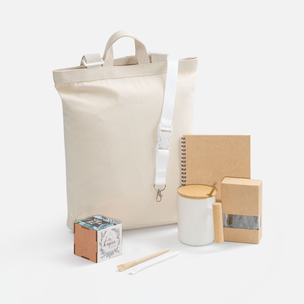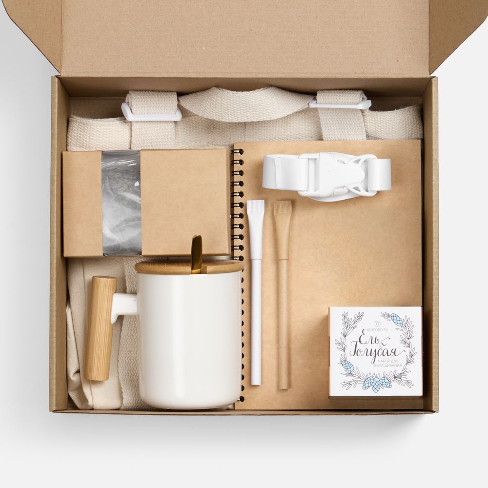 - Материал: рюкзак - хлопок, плотность 280 г/м²; кружка - керамика, ручка - бамбук; ложка - нержавеющая сталь; Набор для выращивания - дерево; блокнот, ручка - картон; коробка - микрогофрокартон, Т-23Е; лента - нейлон, пластик; металл