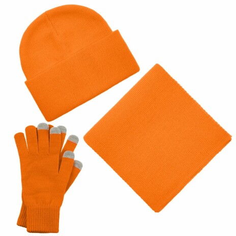 В комплект входят двухслойная шапка с регулируемым отворотом и легкий однослойный шарф из мягкой акриловой пряжи, сохраняющие тепло и защищающие от ветра, а также эргономичные перчатки со специальными токопроводящими волокнами на кончиках пальцев, в которых можно свободно пользоваться смартфоном даже в холодную погоду. Универсальная цветовая гамма и лаконичный дизайн делают набор органичным дополнением к любой верхней одежде.