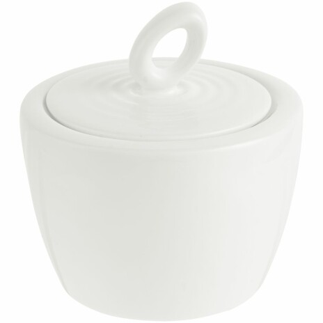 Крышка сахарницы создана в скульптурной технике: фарфор словно запечатлел сам момент движения. Необычная ручка предметов символизирует камень, от которого появляются завораживающие круги на воде.