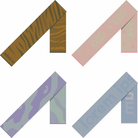 Шарф рельефной вязки с вывязанным логотипом и индивидуальным рисунком в фирменной цветовой гамме. Благодаря определенной схеме вязания со сменой петель создается настоящий стереоскопический эффект, — на таком полотне еще интереснее рассматривать рисунок.