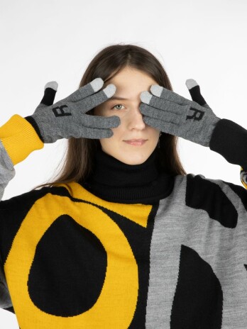 Модель: цельновывязанные бесшовные перчатки с эластичной манжетой и жаккардовым узором в 2-3 цвета. Три пальца: средний, указательный, большой — вяжутся с использованием токопроводящей нити. Манжета может быть полосатой (только горизонтальные полосы 1-2 цветов, без узора и логотипа).