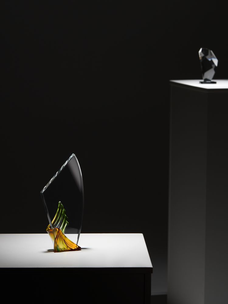 Стела изготовлена из стекла К9, в основе которого лежит оптическое боросиликатное стекло. Эту марку стекла отличает низкий процент посторонних включений, высокий показатель преломления и высокая прозрачность — идеальные качества для изготовления наград премиального уровня.
