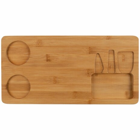 В набор входят доска из бамбука, два керамических соусника, вилка, листовидный нож для сыра твердых сортов, нож-лопатка для мягкого сыра.