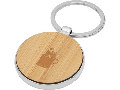 Круглый брелок премиум-качества из бамбука с металлическим корпусом из цинкового сплава, поставляемый в коричневой упаковке из шрифтовой бумаги. Диаметр брелка составляет 3 см. Подходит для лазерной гравировки.