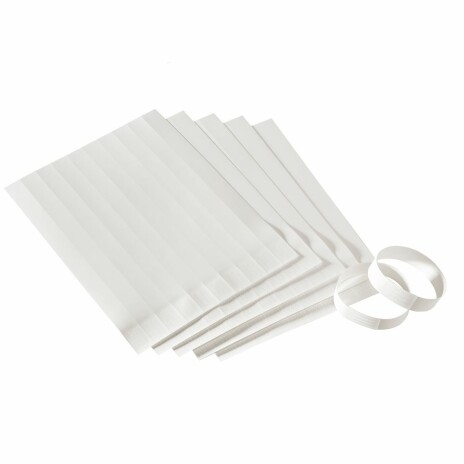 В наборе 100 штук (упаковка из 10 листов по 10 браслетов). Браслет легко отрываются по линии разметки. Изготовлены из водонепроницаемого материала.