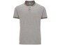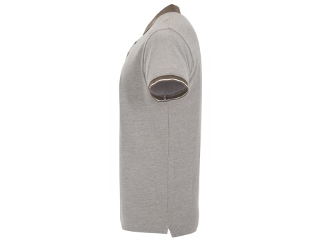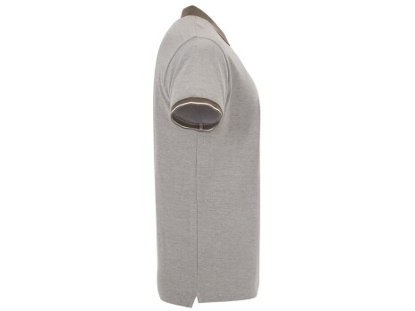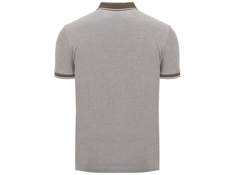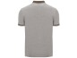 Рубашка поло с коротким рукавом. Манжеты и воротник из однотонного риба 1х1 с контрастными полосками. Планка на 3 пуговицы. Низ с боковыми разрезами, отделанными тесьмой. Спинка немного длиннее полочки. Полотно с меланжевым эффектом.