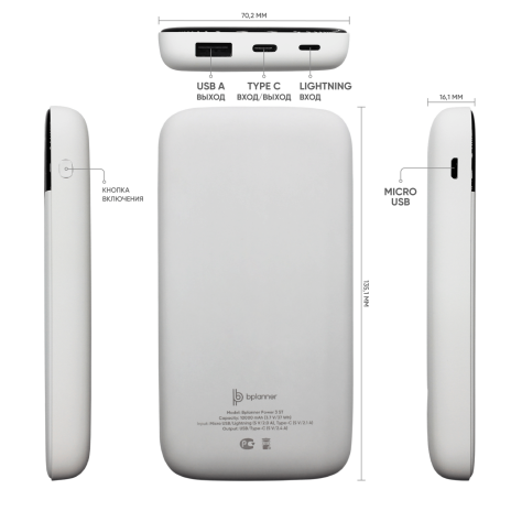 1. Внешний аккумулятор Bplanner Power – функциональное зарядное устройство, которое представлено в различных модификациях и может одновременно заряжать 2 гаджета. Аккумулятор оснащен индикатором заряда и входом Type-С. В комплекте идет кабель 3 в 1 и инструкция.