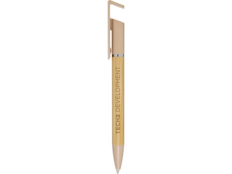 Бамбуковая шариковая ручка, которая также может служить подставкой для телефона. Кнопка и среднее кольцо изготовлены из переработанного пластика, наконечник — из латуни, а корпус — из бамбука, полученного из ответственных источников. Цвет чернил: черный. Длина непрерывной линии: 1000 метров. Размер пера: 1,0 мм. FSC certified bamboo. FSC Mix Credit N5 CU-COC-877277.