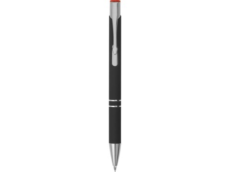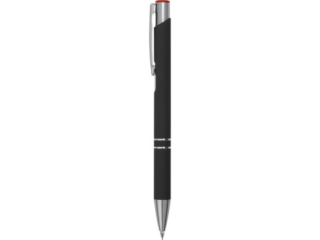 Черная шариковая ручка с кнопочным механизмом и тактильно приятным покрытием софт-тач. Цветная гравировка соответствует цвету кнопки и делает ее еще более изысканным подарком.