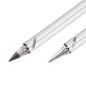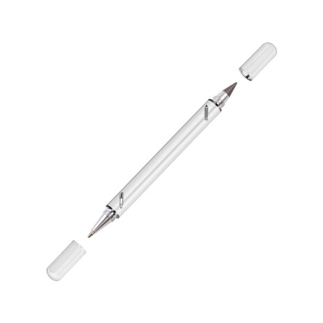 Набор из 2х письменных принадлежностей в едином корпусе - шариковой ручки и вечного карандаша, грифель которого выполнен из сверхпрочного графита с длиной письма до 30 000 метров, Закручивающиеся колпачки надёжно сохраняют пишущие узлы от внешних воздействий.