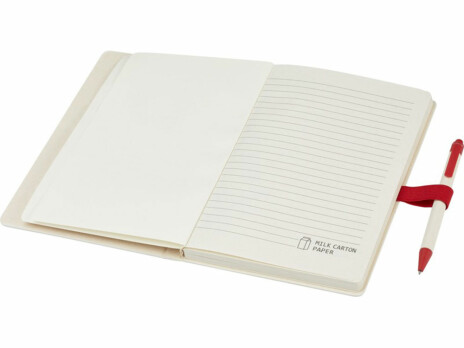 Блокнот A5 Dairy Dream с шариковой ручкой. Блокнот имеет 80 линованных листов (80 г/м²) из переработанных коробок из-под молока (до 70%), цветную спираль для бумаги и петлю для ручки. В петле находится шариковая ручка с кнопочным механизмом, цвет которой соответствует цвету блокнота. Корпус ручки также изготовлен из переработанных коробок из-под молока, а кнопка, зажим и наконечник изготовлены из цветного PLA-пластика. Внутри ручки имеется черный стержень. Картонные коробки из-под молока собираются, сортируются, перерабатываются и превращаются в бумагу, таким образом действительно превращая мусор во что-то полезное.