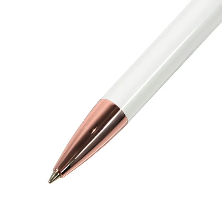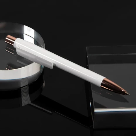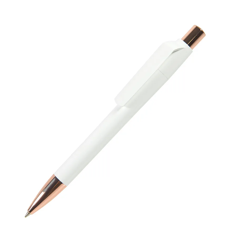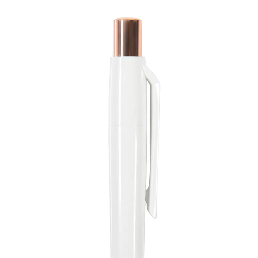Элегантная ручка Mood - символ благородной роскоши и отражение актуальных тенденций мира дизайна. Ручка обладает приятной тяжестью, свойственной металлическим ручкам, и комфортно лежит в руке благодаря плавной обтекаемой форме корпуса. Широкий клип и корпус обеспечивают большое поле для нанесения логотипа, а высококачественный ABS-пластик гарантирует его стойкость и великолепный внешний вид ручки. Металлические носик и кнопка с зеркальным покрытием "под розовое золото". Процесс обработки металлических деталей проходит под тщательным индивидуальным котролем, что гарантирует гладкость и безупречный блеск покрытия. Цвет корпуса, близкий к Pantone White C. Стержень Plastic Parker type, пишущий узел 1.0 мм, синие чернила Dokumental, до 4000 м письма. Производство : Италия