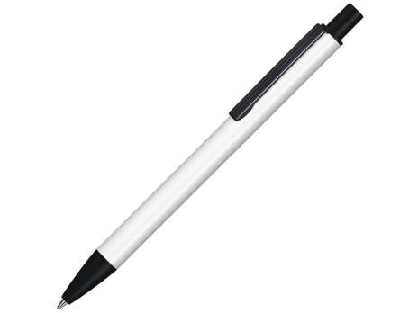Автоматическая шариковая ручка с матовым тонированным черным корпусом и цветным наконечником, широким изогнутым клипом.