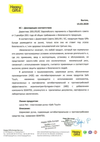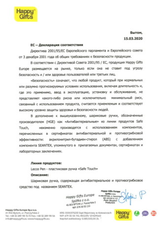 Pantone White. Стержень X-20 с синими чернилами Dokumental и толщиной пишущего узла 1 мм. Обеспечивает до 2000 м письма. Коллекция ручек SafeTouch из антибактериального пластика создана для мест, где важна забота о чистоте и стерильности. Например, медицинских лабораторий и клиник, для мест массового оформления документов - банков, госучерждений, зон клиентского сервиса, где посетители используют одну и ту же ручку. Благодаря специальному компоненту SEANTEX, который используется при производстве ручек SafeTouch, снижается риск накопления бактерий на поверхности ручек в течение дня. Антибактериальные свойства пластика, из которого производятся ручки SafeTouch, подтверждены лабораторными исследованиями, выполненными по международному стандарту ISO 22196:2011. Материал безопасен для кожи и сохраняет свои свойства в течение всего срока службы ручек. ___ Дополнительные файлы: - заключение о результатах испытаний пластика c антибактериальной добавкой SEANTEX по стандарту ISO 22196:2011; - свидетельство о безопасности антибактериальной добавки SEANTEX, выданное компании-производителю добавки; - официальное письмо о безопасности материалов ручек SafeTouch.