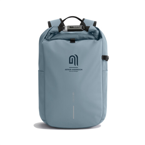 Антикражный рюкзак Urban Roll-top станет идеальным спутником в путешествиях и поездках. Помимо безопасности он гарантирует удобство и комфорт в любых ситуациях. Внутри рюкзака одно большое отделение с сетчатыми кармашками для организации вещей. Со стороны спинки есть мягкий отсек для ноутбука диагональю до 16’’. Снаружи располагаются три кармана: один из них — на спинке — для документов, телефона и других ценных вещей. Есть и два боковых кармана, один из которых нужен для бутылки с водой — ее можно дополнительно зафиксировать с помощью ремешка. Основная фишка Urban — сворачивающаяся верхняя часть. Сложите внутрь все необходимое, застегните молнию, а затем сверните верхнюю часть рулончиком и закрепите усиленными кодовым замком, открыть который сможет только хозяин. Для большего удобства в путешествиях на спинке есть багажный ремень для ручки чемодана. Прочный и стильный рюкзак изготовлен из переработанных пластиковых бутылок и полиуретана. Эти материалы отличаются водоотталкивающими свойствами — это значит, что ваши вещи останутся сухими во время дождя и снега. Общий объем рюкзака — 26 литров. Сертифицировано AWARE™. Наличие индикаторных частиц AWARE™ подтверждает, что мы действительно используем переработанные материалы. 2% с продажи каждой вещи, отмеченной сертификатом AWARE™, мы перечисляем в поддержку всемирной организации Water.org. Зарегистрированный дизайн®