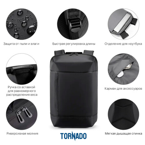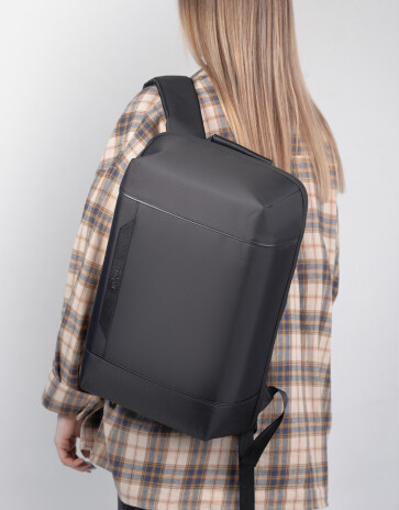 Стильный городской рюкзак для урбаниста. Аккуратный, держит форму, визуально приятный материал с красивым рисунком и гидрофобной обработкой, плотность 572 гр/м2. Удобный на каждый день, мягкая дышащая спинка, крепление на ручку чемодана. Строгая цветовая гамма черный + серый, минимализм в деталях. С внешней стороны нет карманов, риверсивная молния основного отделения с вырезами на пуллерах для установки замка. Открытие на 180º для легкого доступа к содержимому, объем 14 литров.