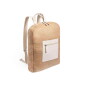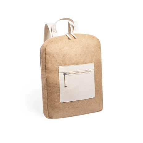 Универсальный рюкзак с двухцветным дизайном. Модель из джута, детали из хлопка. Основное отделение и передний карман на молнии, регулируемые лямки.