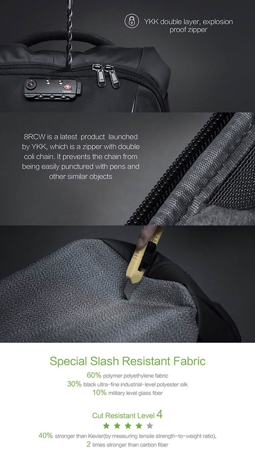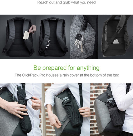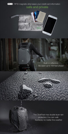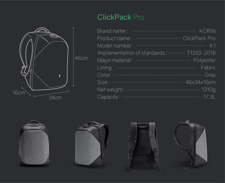 Вместительный рюкзак для путешественников ClickPack Pro из комбинации серого и черного цветов, обладатель премий Good Design Award 2017, Red Dot Design Award 2018, iF Design Award 2018, CMF Design Award, China Red Star Design Award, International Design Excellence Award, Upstyle Award 2018. Размер рюкзака 46х34х16 см, объем 17,3 л, вес 1310 гр. Сделан из высокопрочного устойчивого к порезам и трению водоотталкивающего материала многослойного плетения из разных типов ткани: нейлон, полиэстер и стекловолокно. Не требует специального ухода. Конструкция достаточно жесткая, не деформируется. Детально продуманная организация отделений позволяет грамотно распределить вес. Самые тяжелые предметы располагаются ближе к спине, например, в отделении размером 34х26х3 см для ноутбука диагональю до 15,6” и в кармане размером 19х25 см для планшета диагональю до 10”. Благодаря плотным перегородкам ноутбук и планшет надежно фиксируются и не перемещаются при ходьбе. Специальная анатомическая конструкция и вентилируемая мягкая спинка снижают нагрузку на плечи и спину, вес рюкзака воспринимается на 20-25% легче, чем при использовании стандартных моделей рюкзаков. Конструкция рюкзака позволяет раскрыть его на 180°, чтобы аккуратно уложить в рюкзак много различных предметов. Дополнительно в основном отделении расположены еще 9 карманов различного функционала. 7 открытых карманов под ручки и различные мелочи, 2 кармана на молниях размерами 8х18 см и 12х25 см, в который можно поместить powerbank, т к в него приходит USB-кабель (600 мм, 0,5-0,7 А, 5В), соединенный с портом на внешней стороне рюкзака для легкого подключения к смартфону. Это оригинальная запатентованная система зарядки K EasyCharging 1.0 с помощью USB-порта, расположенного в борту рюкзака, и кабеля, идущего к powerbank, что делает мобильную зарядку более удобной. В комплекте идут 2 органайзера для туалетных принадлежностей и электронных аксессуаров, которые можно зафиксировать внутри рюкзака на липучках, и специальный тканевый чехол с RFID-защитой размером 13х19,5 см. В сильный дождь на рюкзак можно одеть специальный непромокаемый чехол, который защитит его содержимое даже под ливнем или от брызг при поездке на велосипеде или мотоцикле. Рюкзак закрывается на молнию YKK, которую можно зафиксировать с помощью кодового замка TSA007 с функцией таможенного досмотра. Широкие и прочные лямки крепятся к небольшому тканевому борту, что позволяет рюкзаку как бы обхватывать вашу спину. В одном из бортов расположен USB-порт, а в другом - чехол для зонта или бутылки с водой, который при использовании фиксируется специальным креплением. На правой лямке рюкзака находится easy access карман размером 12х6 см на молнии, на левой - открытый карман 10х5 см. На внешней стороне рюкзака в стыке серого и черного цветов спрятался треугольный карман на молнии размером 16х9 см с застежкой фастекс для ключей, которая позволяет вам легко отстегнуть/пристегнуть ключи. На спинке рюкзака расположен внешний потайной карман размером 15х29 см на молнии. Для его защиты достаточно того, что он вплотную прилегает к вашей спине и вытащить что-то из него без снятия рюкзака невозможно. В дополнение к вышеперечисленным средствам защиты рюкзак ClickPack Pro оснащен стальным тросом, которым можно обхватить неподвижный предмет и затем зафиксировать в кодовом замке. Сверху расположена ручка из полиуретана, за которую при необходимости удобно нести рюкзак в руках или закрепить 
