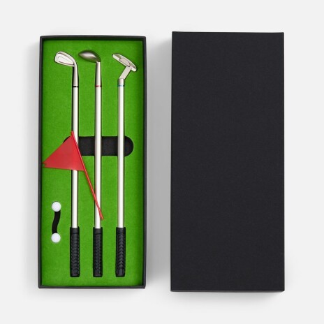 В комплекте: 3 клюшки-ручки со сменным стержнем с синими, черными и красными чернилами, 2 мячика для гольфа, флажок и подарочная коробка.Не является детской игрушкой. Не предназначено для детей!