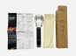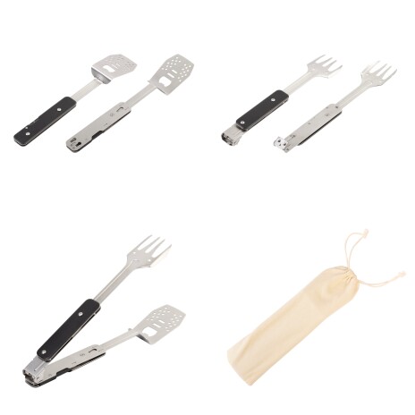 4 аксессуара: лопатка, вилка, щипцы и открывашка в одном инструменте. Размер в сложенном виде всего 6 х 22,5 х 2,6 см, в комплекте есть чехол из хлопка для хранения.