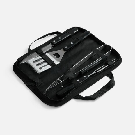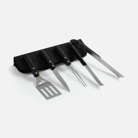 - Размеры: вилка: 29х2,5х1,5 см; лопатка: 28,5х7х1,5 см; щипцы: 33х2,5х6 см; нож: 29х2,5х1,5 см; чехол: 36х11х5 см