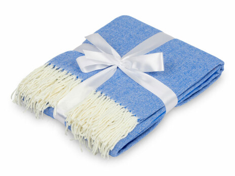 Большой размер этого мягкого плотного пледа позволяет использовать его как одеяло и как покрывало для вашего интерьера. По бокам плед украшен бахромой. В комплекте идет упаковочная синяя лента, на которой можно сделать нанесение вашего логотипа.