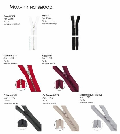 Молния на воротнике длиной 20 см. Основа черного цвета, молния и бегунок — серебристые. Другие цвета по запросу.