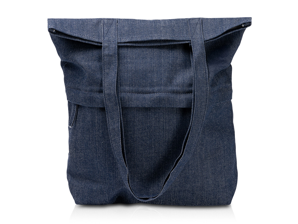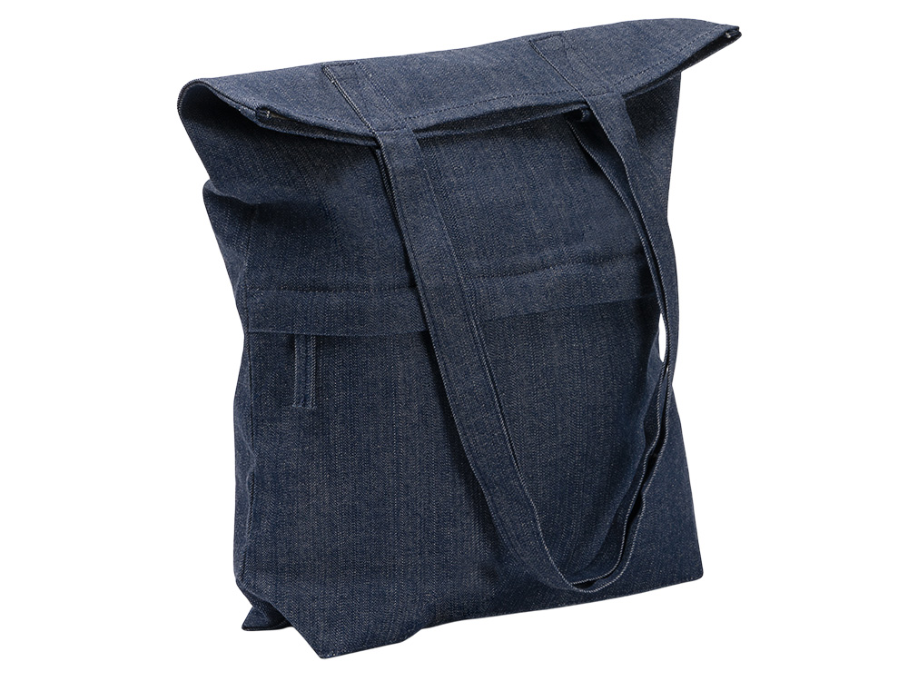 Сумка из переработанной джинсовой ткани с передним карманом на застежке. Высота ручек 29 см.