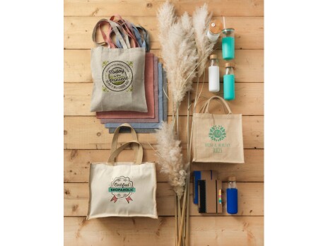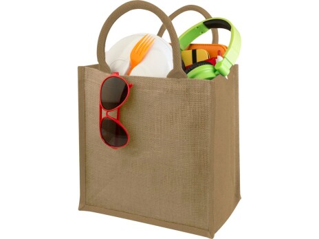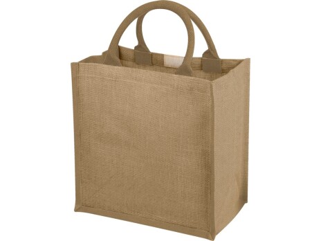 Джутовая подарочная сумка Chennai. Джутовая сумка с ламинированным открытым основным отделением и вставкой. Хлопковые ручки высотой 11,5 см. Джут.